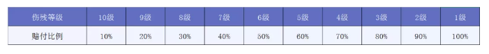 如上图,伤残等级分为十级,1级最严重,10级最轻,赔付比例也分为10档,10级赔付保额的10%,9级赔付保额的20%,以此类推。