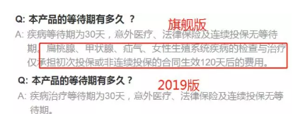 在常见问答中,升级后的2019版不再对扁桃体、甲状腺、疝气、女性生殖系统疾病的检查与治疗设定理赔时间限制。