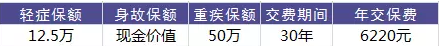 我们来举个栗子便于理解:张先生今年30周岁,购买达尔文1号,重疾保险金额50万元,轻症疾病保险金额12.5万元,交30年,保险期间保至终身,每年缴纳保费6220元。