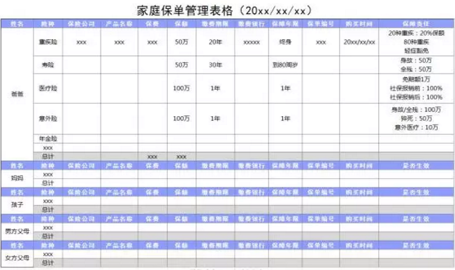 用这样一张表格,我们可以清楚简洁地看到,家庭成员的保障情况,谁还缺什么险种,谁的保额不足等等,都非常明朗。通过保费总计来调整自己的预算,通过保额来判断自己是否还需要再加保等,一张表格就能掌握全家的投保情况,是非常方便的。