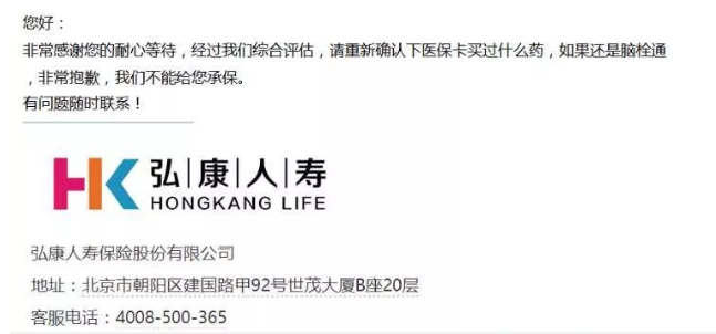 多保鱼建议他向弘康人寿提交补充告知,保险公司返回结果是:如果确认是脑栓通,将拒绝承保。
