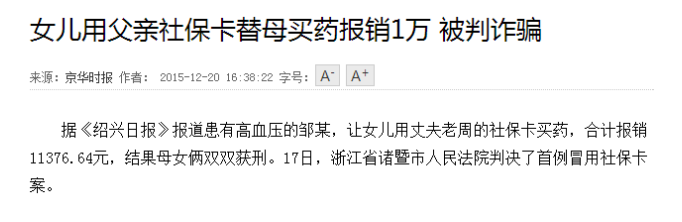这不是危言耸听。在2015年,就有新闻报道过,浙江一女子因冒用父亲社保卡替母亲买药报销,与母亲被双双判刑。