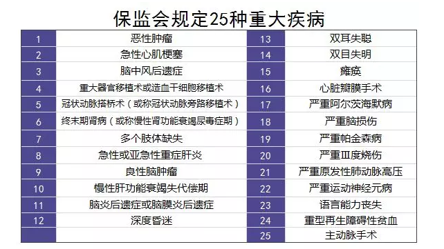 保监会规定重疾险产品必须包含的25种重大疾病,已经涵盖了绝大多数常见疾病,占重疾险理赔的95%左右。而保险公司把其他的不常见疾病添加进来,提高到上百种,也不过是锦上添花,理赔重心仍在保监会规定的25种重大疾病里。