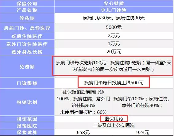 免赔额:对!它还有免赔额的!而且还是按次数算的!安心少儿门诊险算是比较良心的了,如果5天内在同一科室连续治疗,只扣一次免赔额,也就是100元。