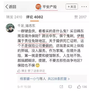 不仅如此,在这条微博下面,平安产险的官方微博点赞了一条评论: