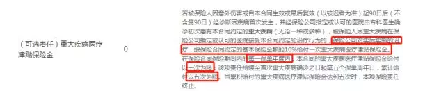 即:确诊重疾后,在指定医院治疗的,每年给付一次额外10%基本保额的保险金,持续至确诊日后的第5个保单日,累计给付5次。