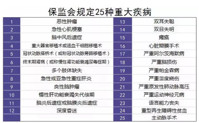 保监会制定了25种重大疾病,要求所有重疾险都必须包含它们,并且疾病定义和理赔标准都必须一样,不准修改。而这25种重大疾病,已经占了所有重疾理赔的95%以上。