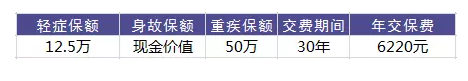 张先生今年30周岁,购买达尔文1号,重疾保险金额50万元,轻症疾病保险金额12.5万元,交30年,保险期间保至终身,每年缴纳保费6220元。