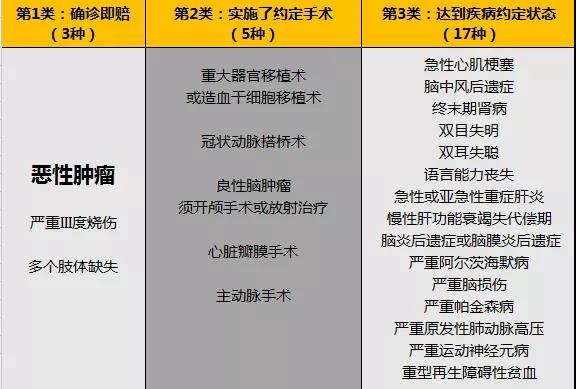 以这25种重疾为例,重疾的理赔大致可以分为三类:1、确诊即赔;2、实施了某种手术才能赔;3、达到某种疾病状态才能赔。