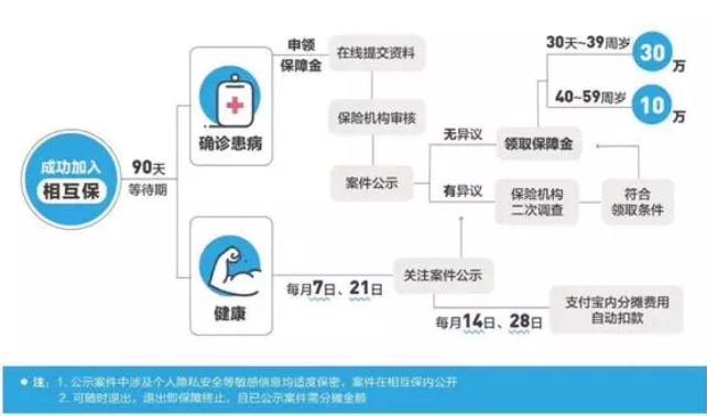 0元门槛,加入相互保之后,如果发生了100种重大疾病,就可以获得10万或30万的理赔金,而这笔钱,则需要相互保里其他还没有生病的成员平摊。