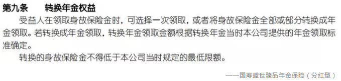 1)合同出险的情况下,所得的保险金额(身故保险金)不一次性领取,而是转换成年金,每年固定领取。