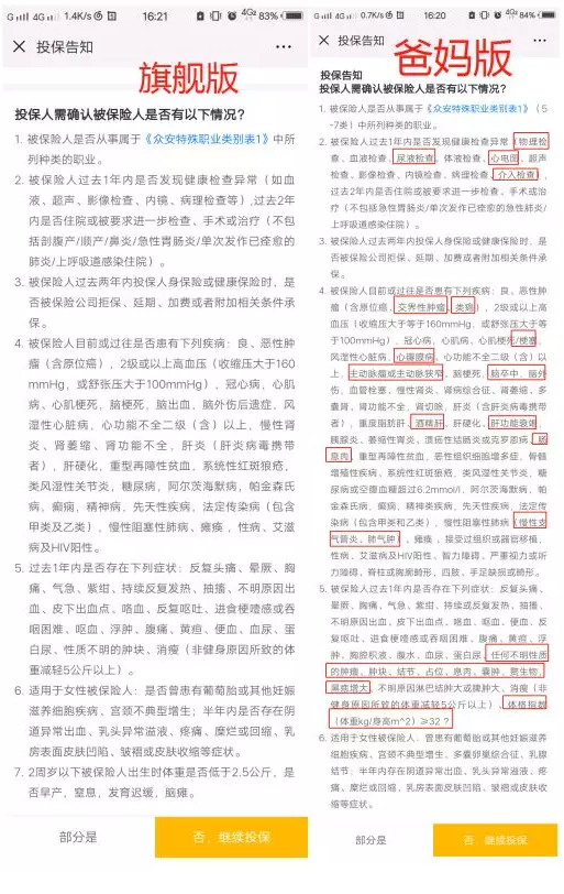 所以,在健康告知的设置上,爸妈版要比旗舰版更加严格一些。