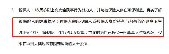 “投保人需以投保人或被保人身份持有当前有效的尊享e生2016/2017、旗舰版、2017PLUS保单;或同时为自己投保一份尊享e生旗舰版”