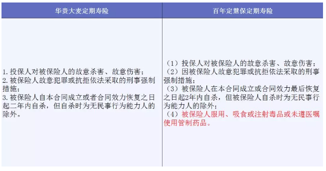 综上,在责任免除方面,华贵大麦寿险要比百年定慧保寿险更有优势一些。