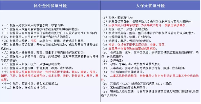 高风险运动:人保无忧指明专业运动员或从事专业运动的除外,但没有举例一些常见的高风险运动名称。昆仑金刚列举了十几个高风险运动,但没有将专业运动员排除在外,这一点两款产品不相上下。