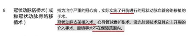 条款中只保障冠状动脉搭桥手术,并且注明:冠状动脉支架手术不在保障范围。