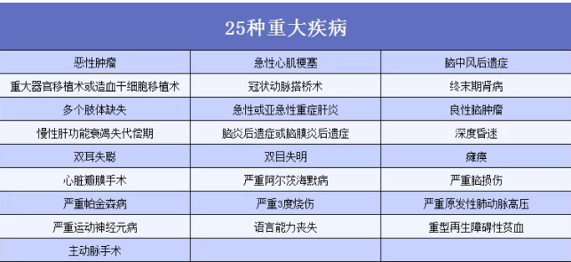 25种重大疾病:保监会规定了25种重大疾病,所有重疾险必须包含!且疾病定义和理赔标准都必须一样。