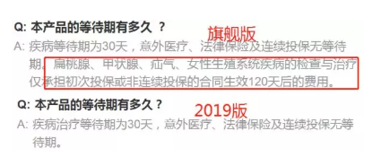 在常见问答中,升级后的2019版不再对扁桃体、甲状腺、疝气、女性生殖系统疾病的检查与治疗设定理赔时间限制。