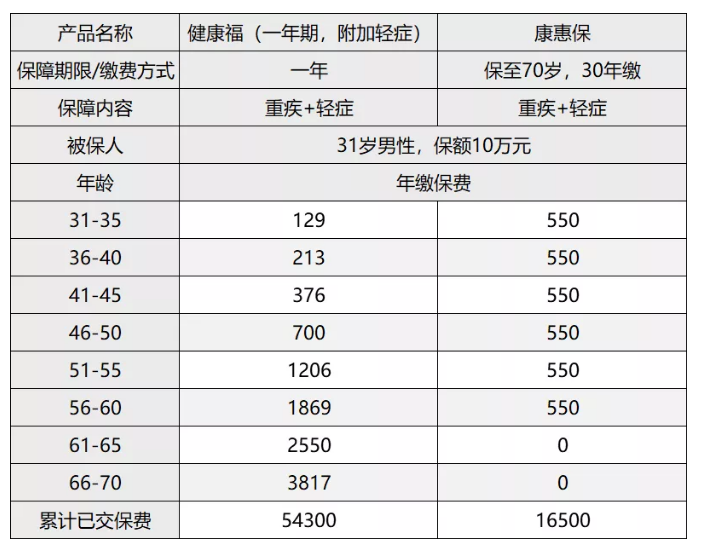现在来看看直观的对比,以下是健康福(一年期)和百年康惠保年缴保费对比: