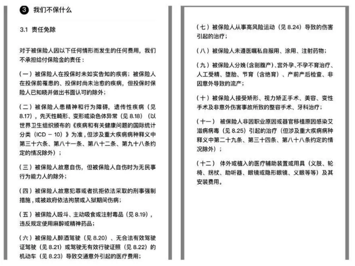 不保什么,也就是责任免除,看了下和大多数普通的百万医疗险相似,中规中矩。我们要特别记得的是既往症和先天性及遗传性疾病是不保的。