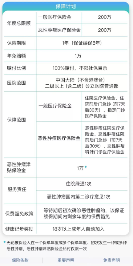 条款规定,在保险期间,若罹患有恶性肿瘤,额外获得1万元津贴。这相当于癌症医疗0免费补偿。但是,这10,000份津贴只能收取一次,相当于只有一次机会抵消免赔额。