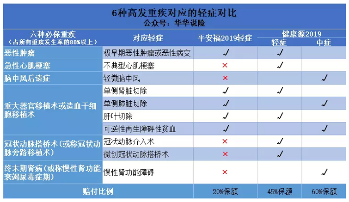 可以看出,覆盖了与轻症对应的6种高发重疾,可以看出健康源2019的轻症/中症的保障更全面。
