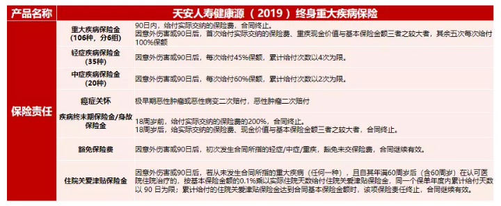 天安人寿保险健康源2019终身重大疾病保险的保险责任如下: