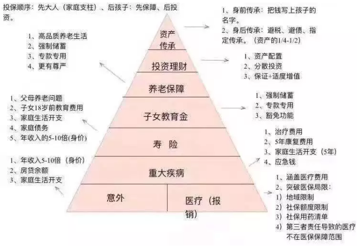 下图是一个常见的保障 金三角族。从配置的底部,一般原则是首先配置基本的保障,然后配置教育和养老金,首先“雪中雪”,然后“锦上添花”。首先覆盖大风险、然后覆盖小风险,即孩子之后的第一个成年人(经济支柱)。这将允许有限的资本预算用于最前沿,以完成家庭资产分配的重要部分。
