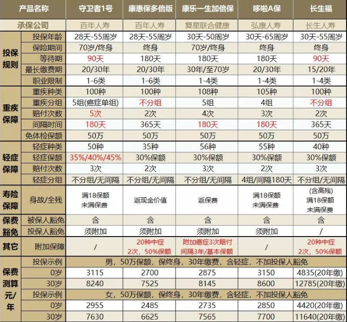 4.从保费的价格上看,50万保额缴费30年,百年的康惠保(多倍版)具有最低价格,其次是守卫者1号、康乐一生加倍保性价比也很高。