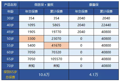 如图所示,微医疗保险重疾的保费逐年增加。几十年来,总的保费比康惠保贵得多。这是自然费率和均衡费率之间的差异。因此,我们不能简单地认为一年产品便宜,还要结合长远的保障时间来看。