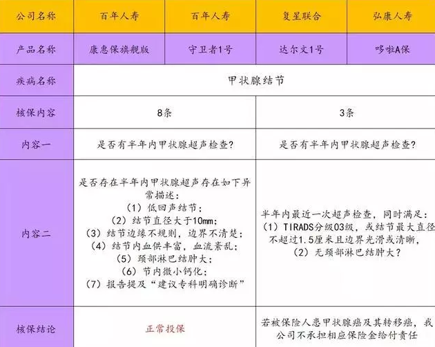 同一疾病公司的核保结论和核保的内容也不一样。下面我发现目前市场上出售的一些良好的健康风险,以“甲状腺结节”为例。要看谁的智能核保是最放松的。