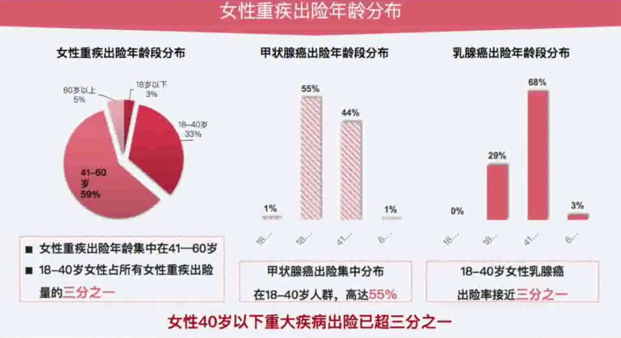 排名前三位的高危女性是甲状腺癌,乳腺癌,肺癌。就业的年龄集中在41-60岁,18-40岁的女性已占到所有女性的重疾风险的三分之一。 18至40岁女性的乳腺癌风险率接近三分之一。