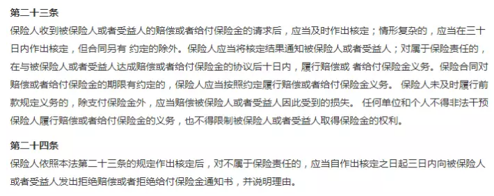 换句话说:保险公司申请我们的理赔,即使情况比较复杂,理赔批准也不能超过这个截止日期的30天;即使它不在理赔范围内,也必须在3天内通知我们!