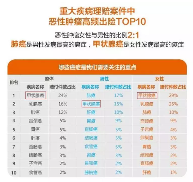在癌症理赔中,甲状腺癌是一种高发病种,无论是男性还是女性: