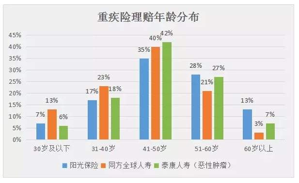 下面是阳光保险、同方全球人寿、泰康人寿的重疾年龄分布: