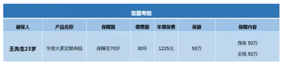 寿险,精算师列出的产品可以说是非常划算的,50万保额,每年支付保费1225元,支付30年,支付期限长,减少了保费的年度压力。