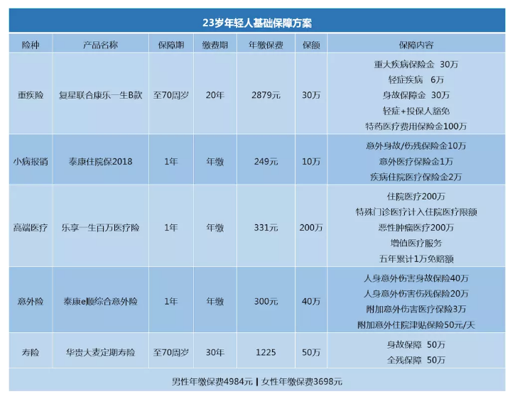 如果你二十几岁且经济条件已经稳固,你可以增加保额鲲购买终身保障产品,甚至准备退休保险。例如,上面的基本计划,危重病保障增加到50万,寿险配额增加到80万,23岁男性支付保费也不超过1万元。