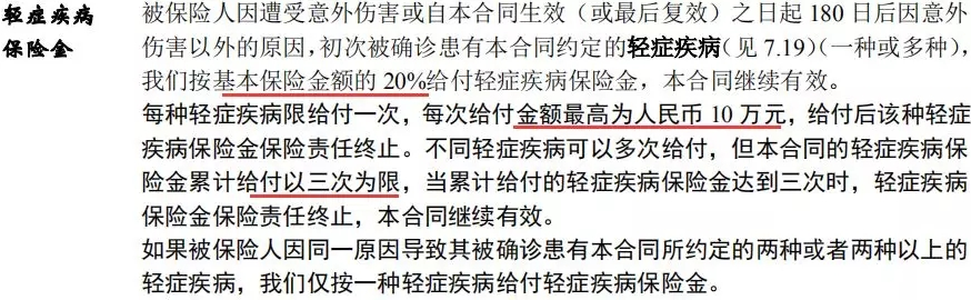 轻症:30种,赔付3次,赔付20%基本保险金额