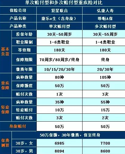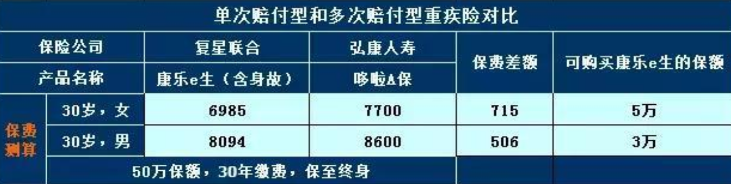 首先,我们比较一下。单个赔付严重疾病以复星联合康乐e生为例子,多次赔付严重疾病是弘康哆啦A保为例。让我们对比一下,看看两种产品之间的区别。
