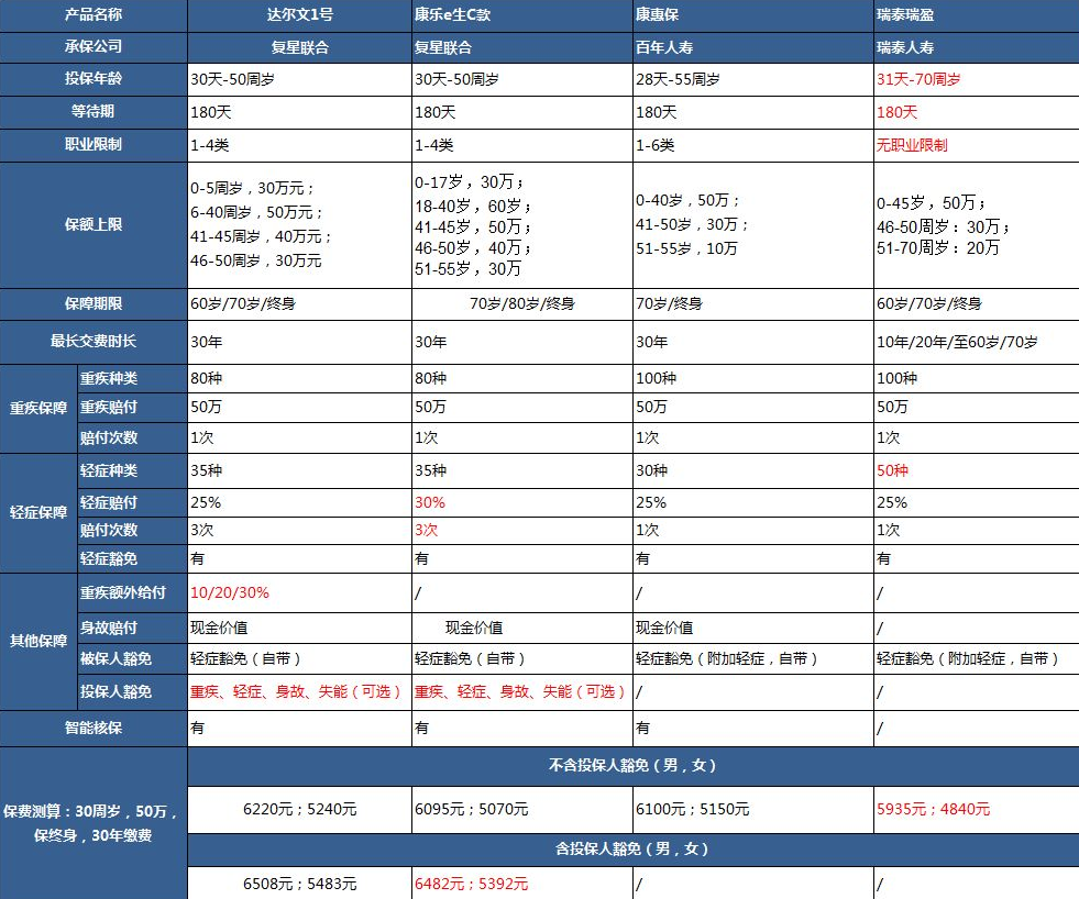 为了便于比较,多保鱼把达尔文1号、百年康惠保、 瑞泰瑞盈和复星联合康乐e生中进行了比较: