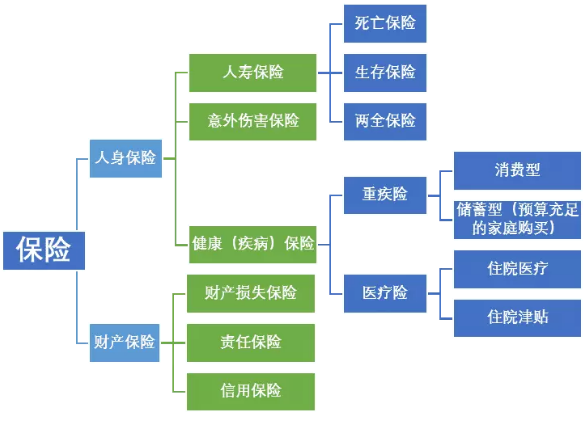 首先,我们要知道,在保险上面,从主体划分的话,就分为人身保险和财产保险两大类。当然,我们要说的只有人身保险这一类,人身保险,其中还分为人寿保险、健康(疾病)保险、意外伤害保险三类。
