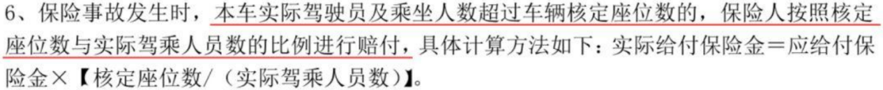 例如,每个座位保险金额为100,000,汽车有5个载体。在发生事故时,有6个人坐在车里,所以每个人的赔补偿是10 * 5/6 = 83,000。