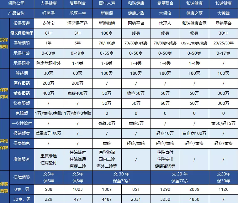如果你想要一个更长期的续保:市场上的几款新产品,一般保额低、保费不便宜,并且不适合普通工资家庭。