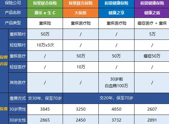 多保鱼以复星康乐 e 生 C 款消费类型重疾的保险基准,与其他三种医疗保险相比。