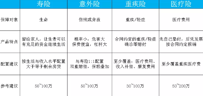 以前我们讲过,男性(大部分)作为家庭的经济支柱,是一个家庭中最需要配备保险的人,毕竟你的健康才是对其他家人最好的保险。如果是中产男性又怎么买保险比较好呢?保鱼君的建议是,一定要把保险买全,我们先用图片来概括一下人生中需要配置的四种保险的基本情况。