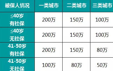 但并非所有人都可以购买200万保额,被保人年龄、所在城市、社保缴纳情况对保额产生影响。详情如下所示: