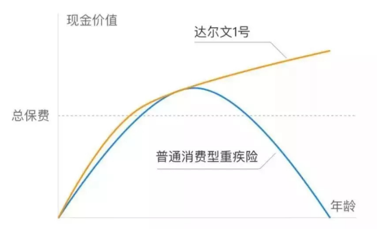 一般消费类型的重大疾病保险的现金价值是第先高后低的趋势,但达尔文1号的现金价值随着年龄的增长而增加,并且可以返回保额的95%。用消费型的价格购买返还类型的价值。