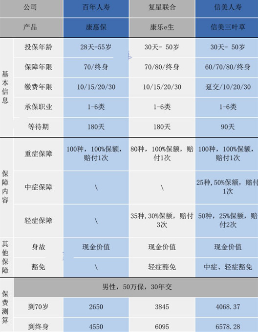 下面我们简要介绍三款严重疾病的产品,包括:只保重症疾病的百年康惠保重大疾病保险;保障重大疾病和轻症的复星联合康乐e生重疾险C款;保障轻症、中症和重症信美三叶草。