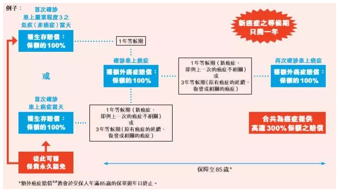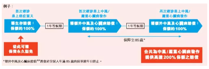 就首次因严重程度2或3之危疾已付或应付生存赔偿后,第一次从诊断日期开始的基本计划的保费将永久为豁免,并且被保险人可以免费享受保障至保单终止。