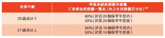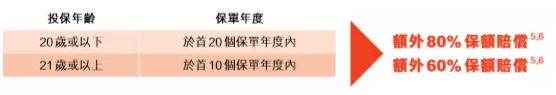 如果被保险人在首20个保单年度内(保险年龄为20岁或以下)或前10个保单年度内(保险年龄为21岁或以上)不幸死亡或严重程度3之危疾(呼吸系统疾病除外),我们将支付80%保额(保险年龄为20岁或以下)或60%保额(保险年龄21岁或以上)的额外死亡赔偿或额外的生存赔偿,以帮助被保险人减轻医疗负担,并安心接受治疗。
